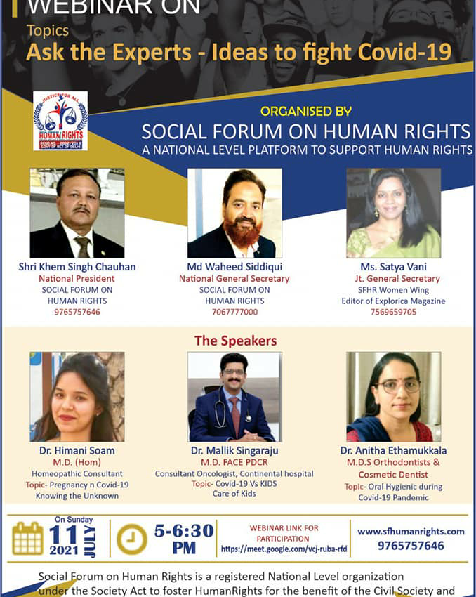 Social Forum on Human Rights conducted a webinar on 11th of July 2021 ( Sunday)from 5:00 -6:30 pm for the same. The motto behind this session was to educate everybody at the forum about Covid-19 and it’s prevention.