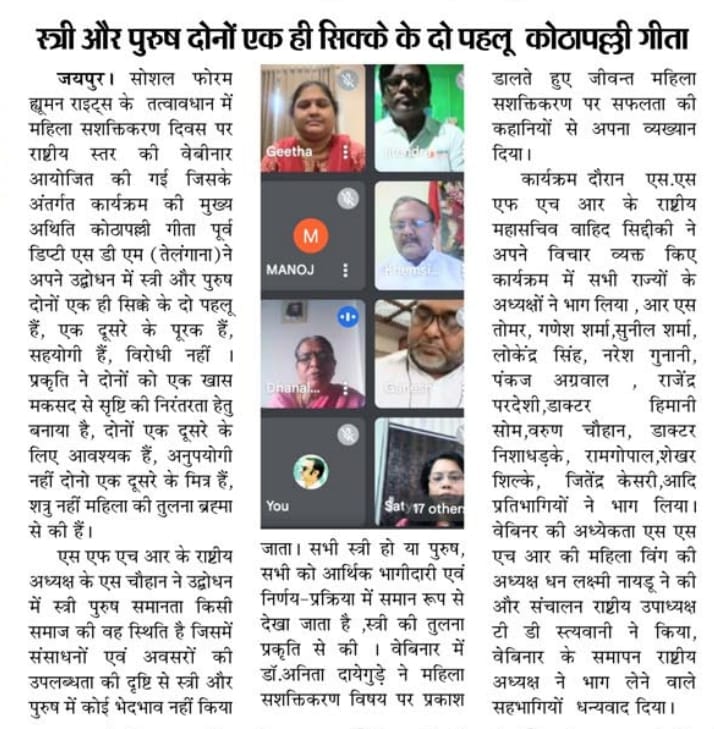 Media coverage for seminar conducted by SFHR on the occasion of international women’s day on 8th March 2022.on Google meet from 5.00 pm to 6.30 pm.