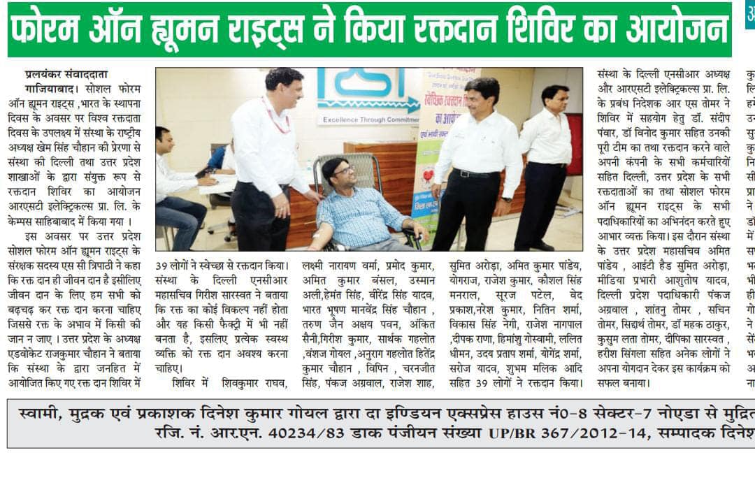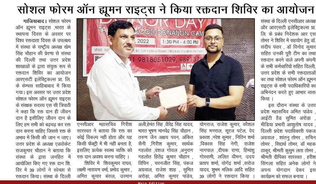 A blood donation camp was organized on the “Foundation day” of the Social Forum on Human Rights on 14th of June 2022 at RST Electricals, Ghaziabad, UP.