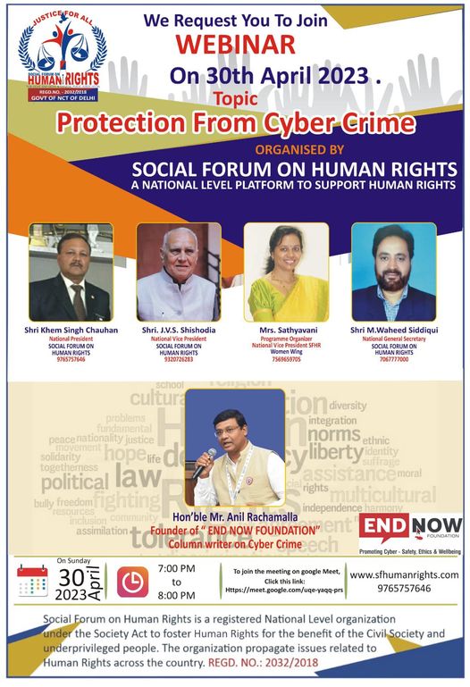 The Speaker will be Hon’ble Mr. Anil Rachamalla (founder of End Now Foundation, and Column writer on CYBER CRIME, from Telangana.)