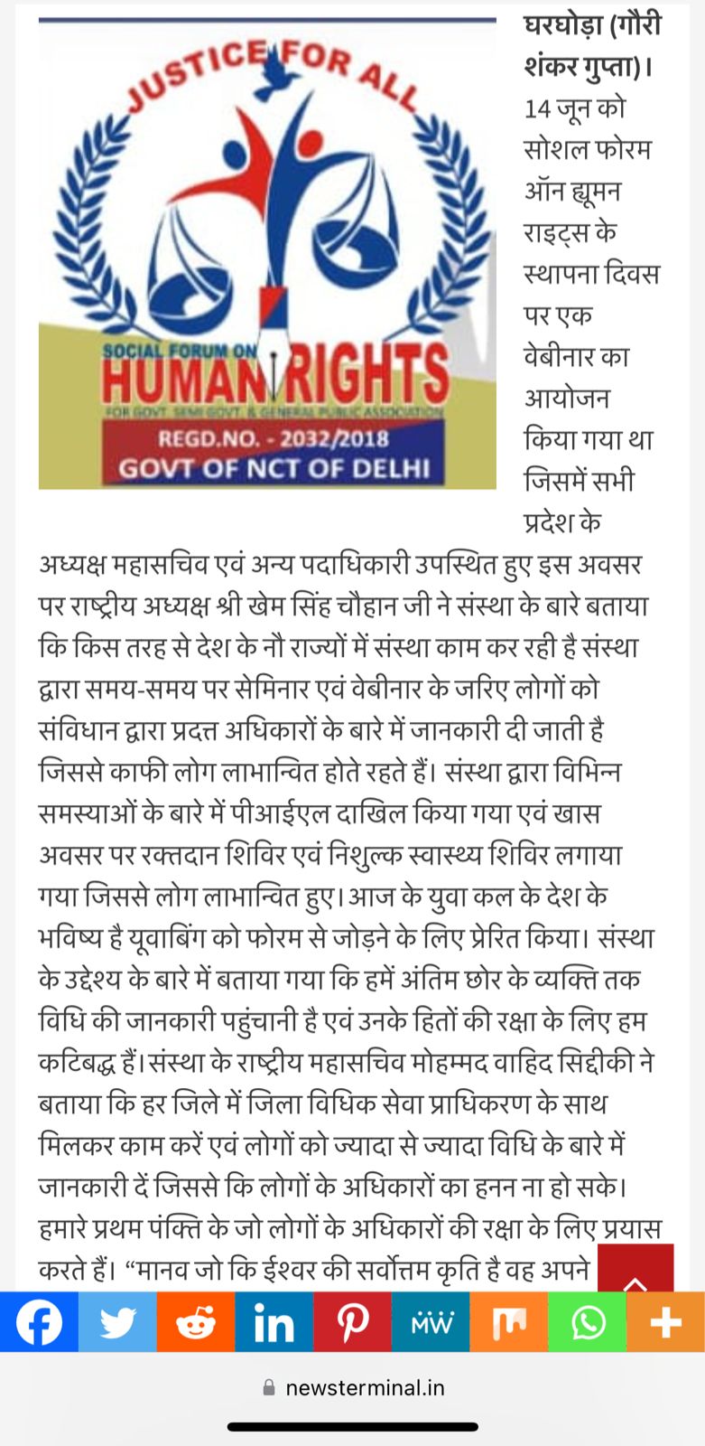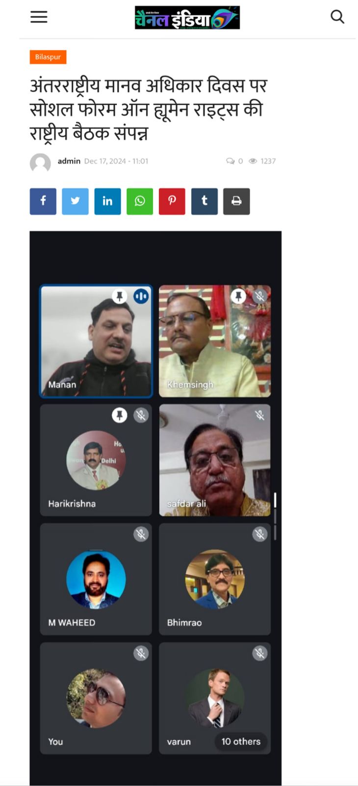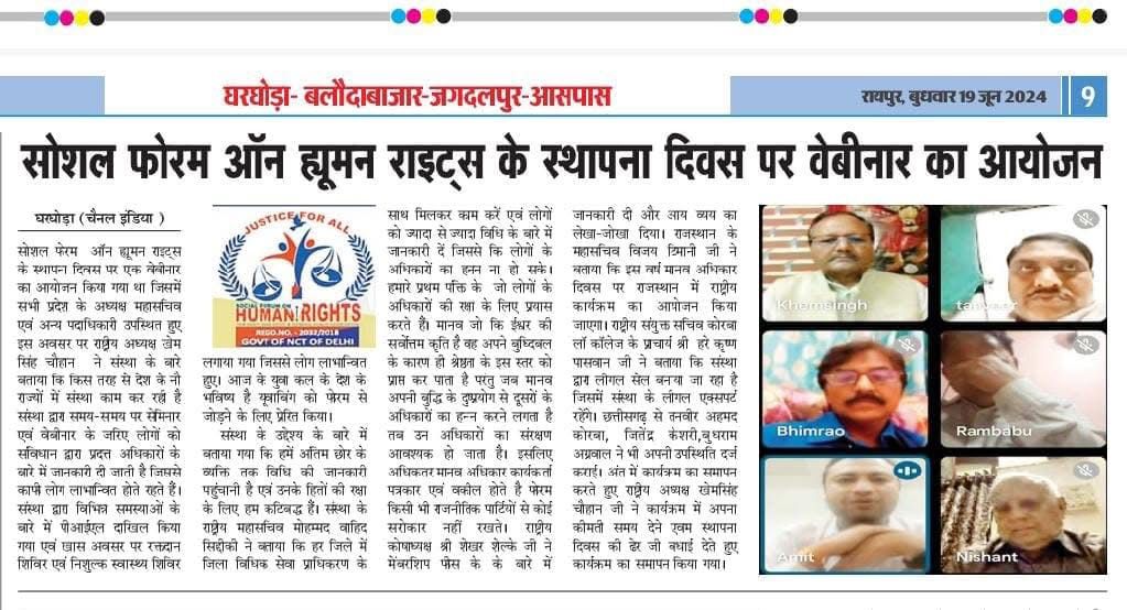 14th June, on the occasion of foundation day of Social Forum on Human Rights a virtual meeting was conducted via google meet. The governing body of SFHR had joined the meeting from various parts of the country.